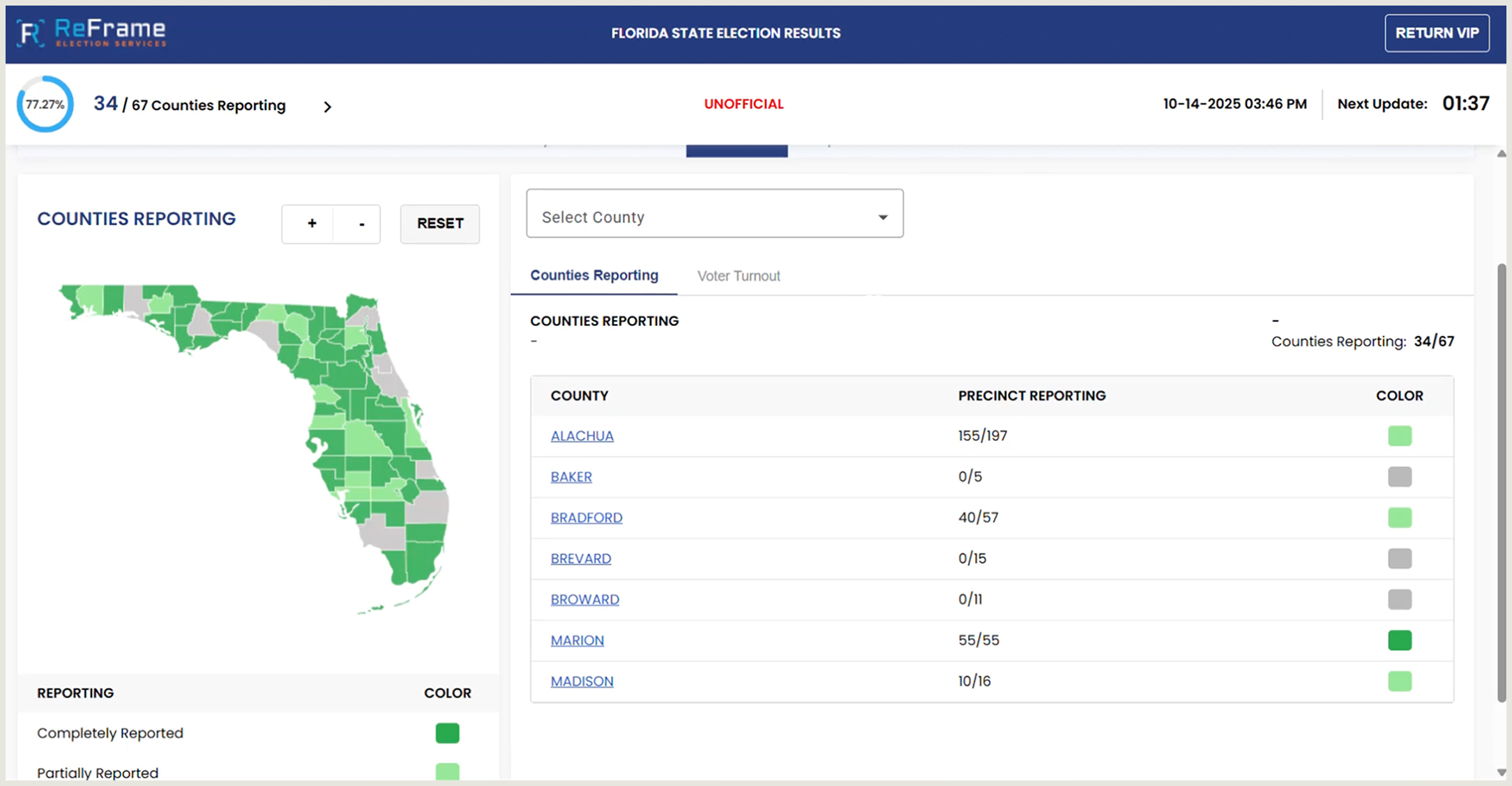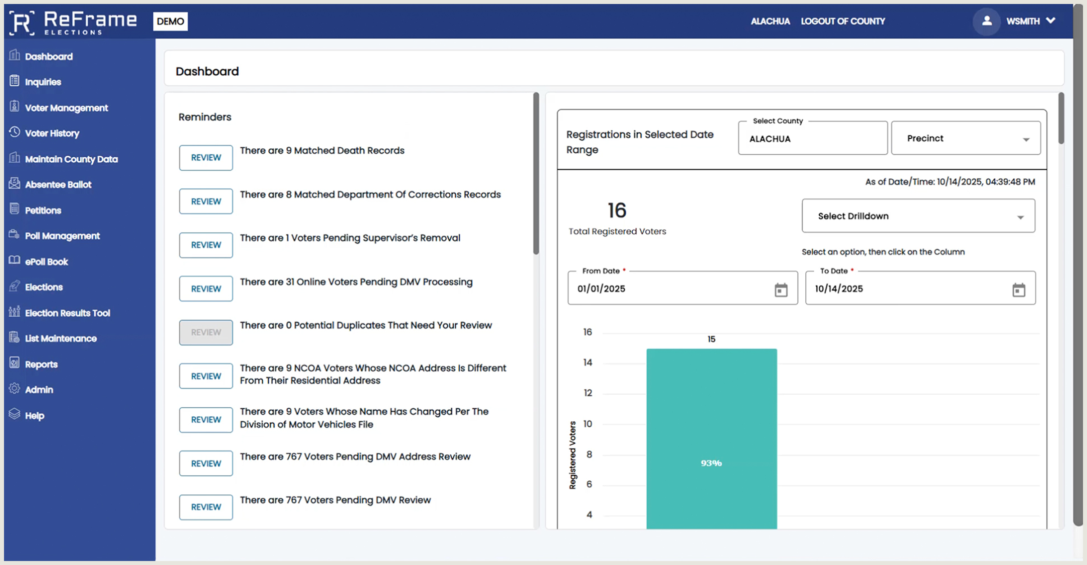 Each module works together seamlessly or as stand-alone modules, streamlining operations and improving accuracy. ReFrame Elections supports real-time dashboards, automated data validation, and configurable workflows—so your team can manage elections with confidence and control.